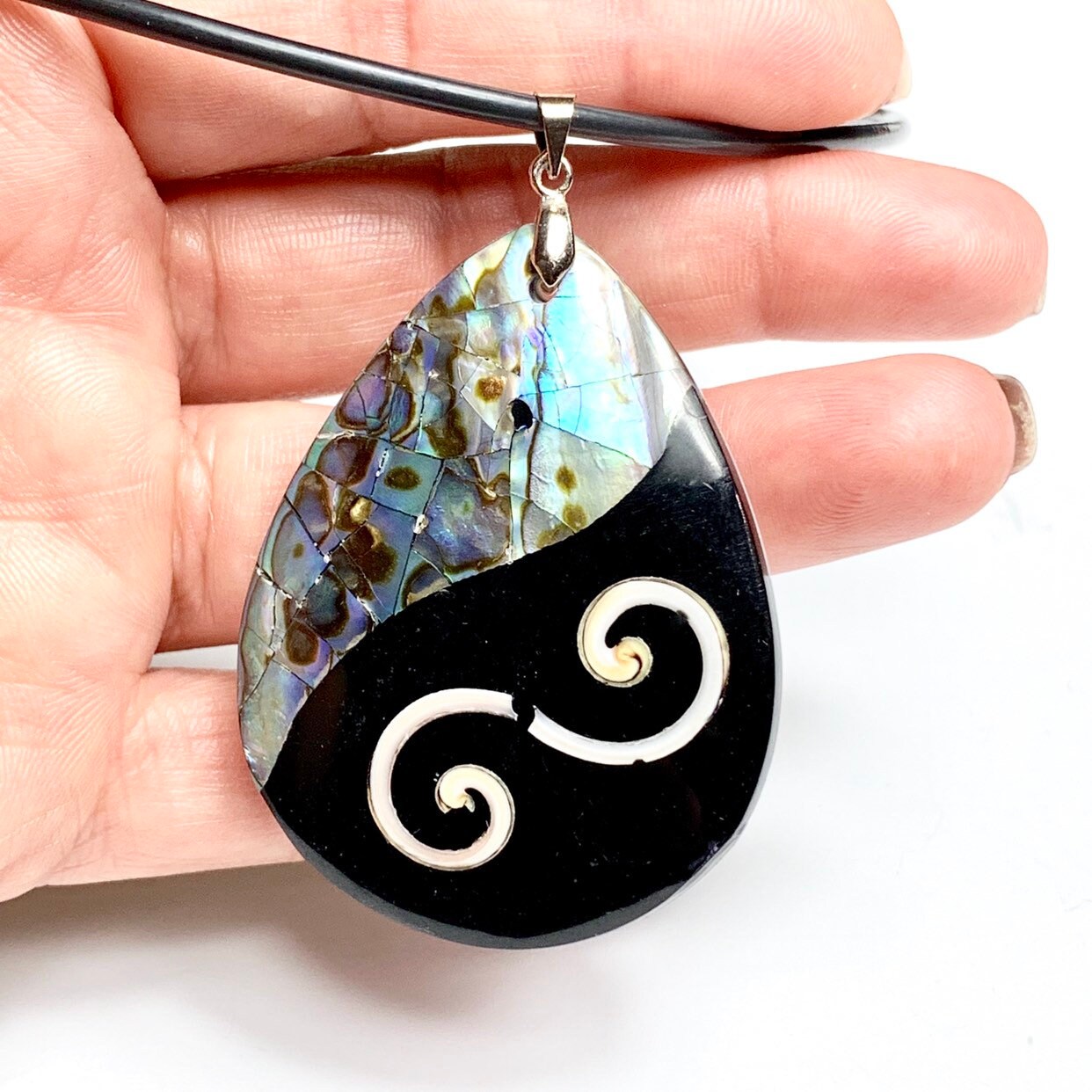 16" long, one of a kind, handmade with hard cable wire, 2x1.5 Tear Drop Abalone Shell and Mother of Pearls Pendant.